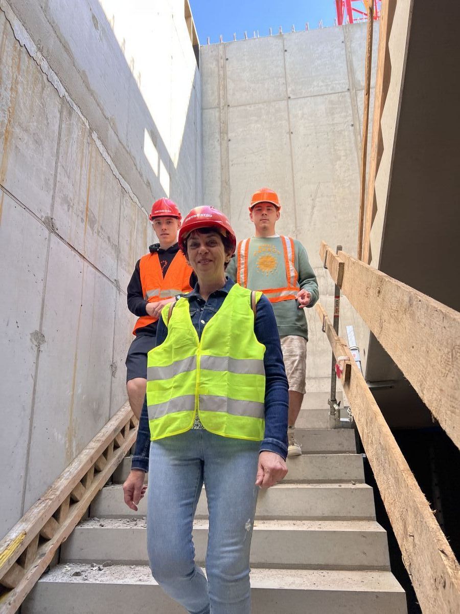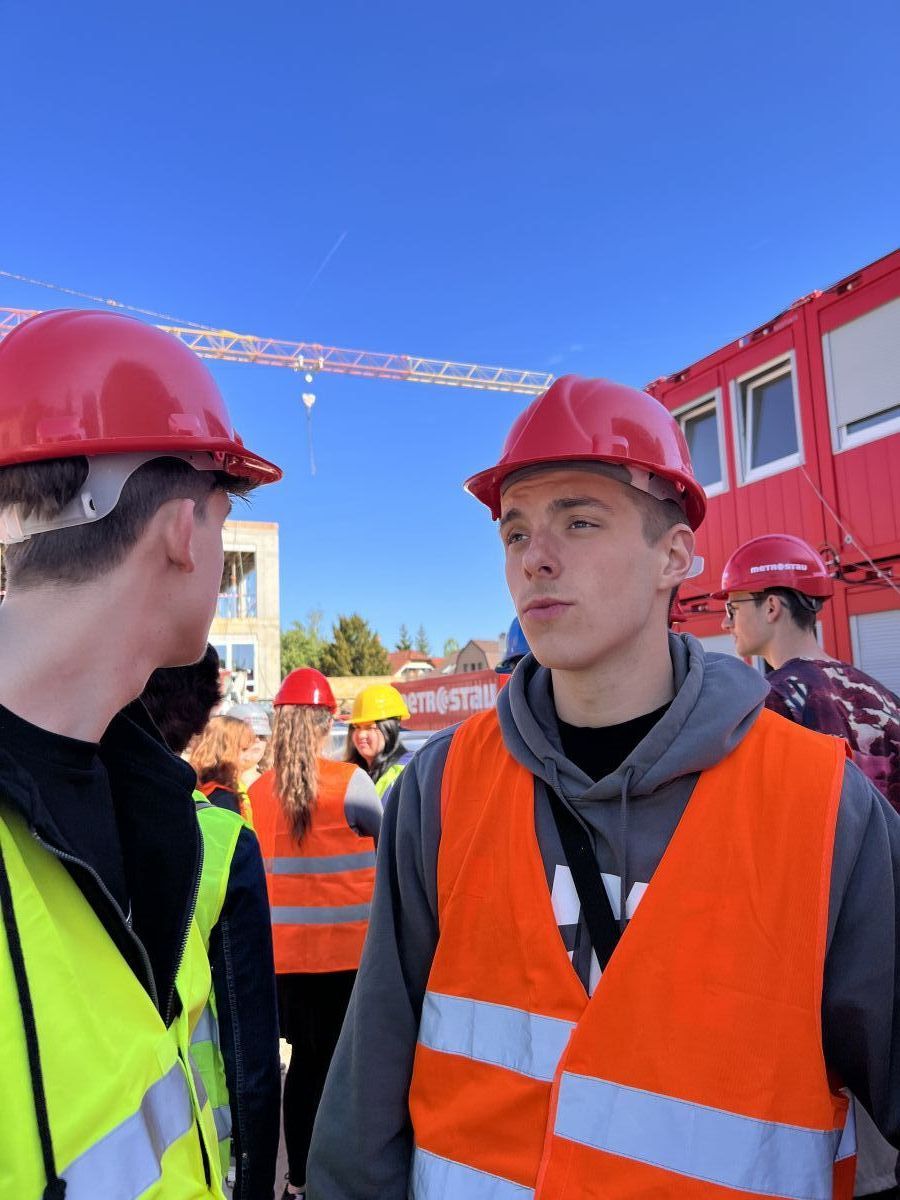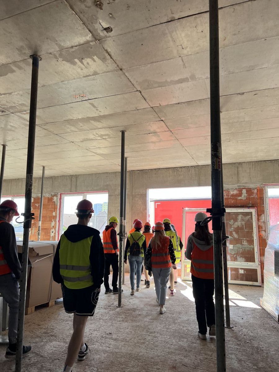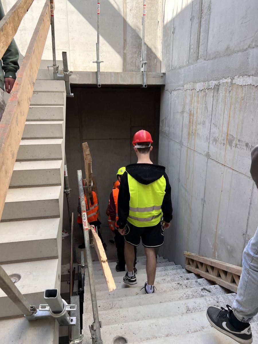 Žáci viděli skeletovou nosnou konstrukci s vyzdívkami, prefabrikované schodiště, rozvody TZB, dokončování souvrství a atiky na ploché střeše.