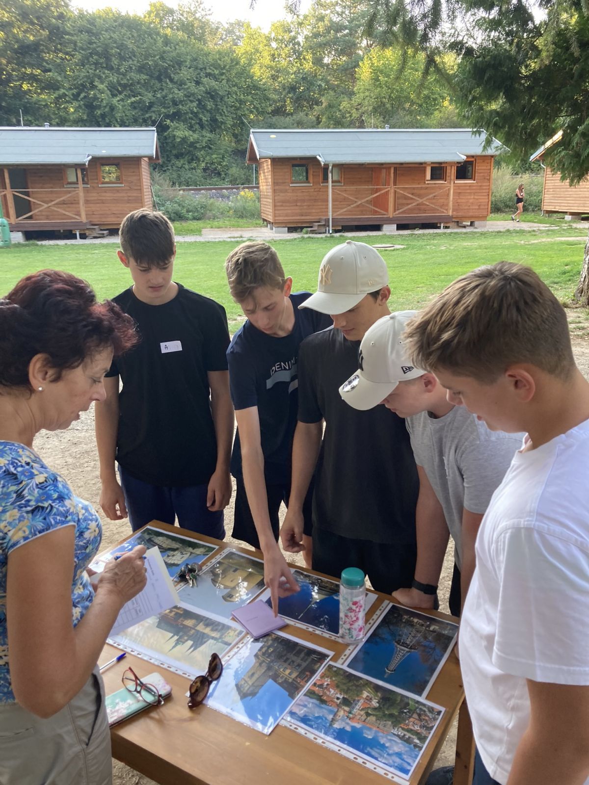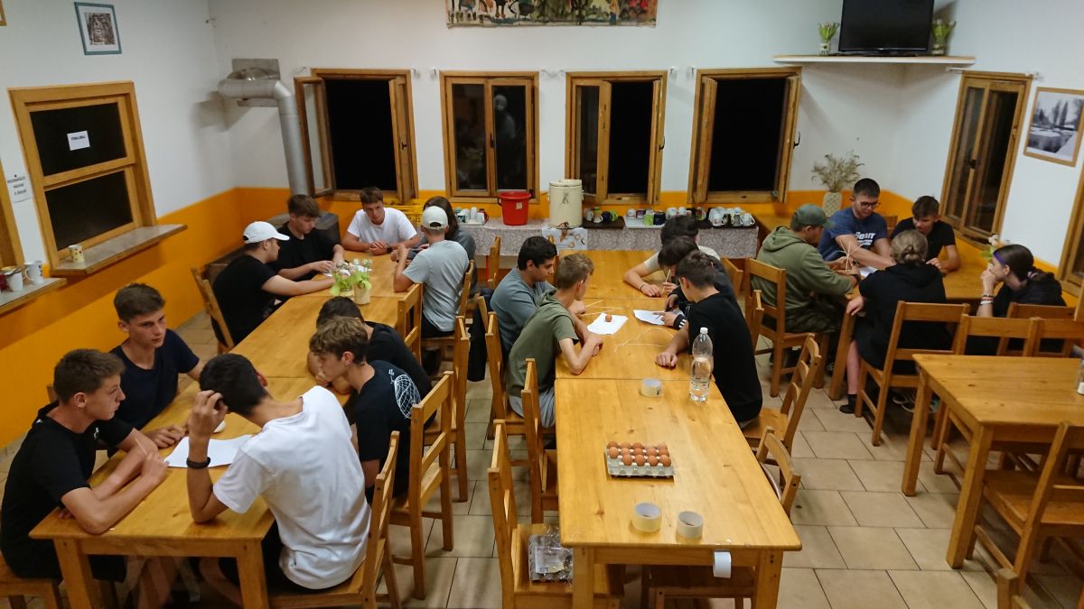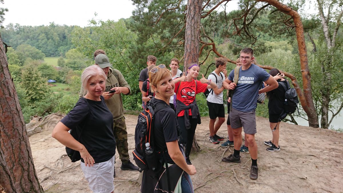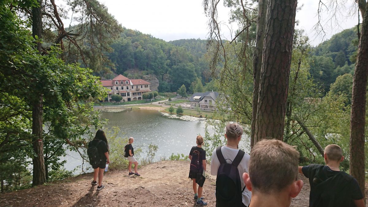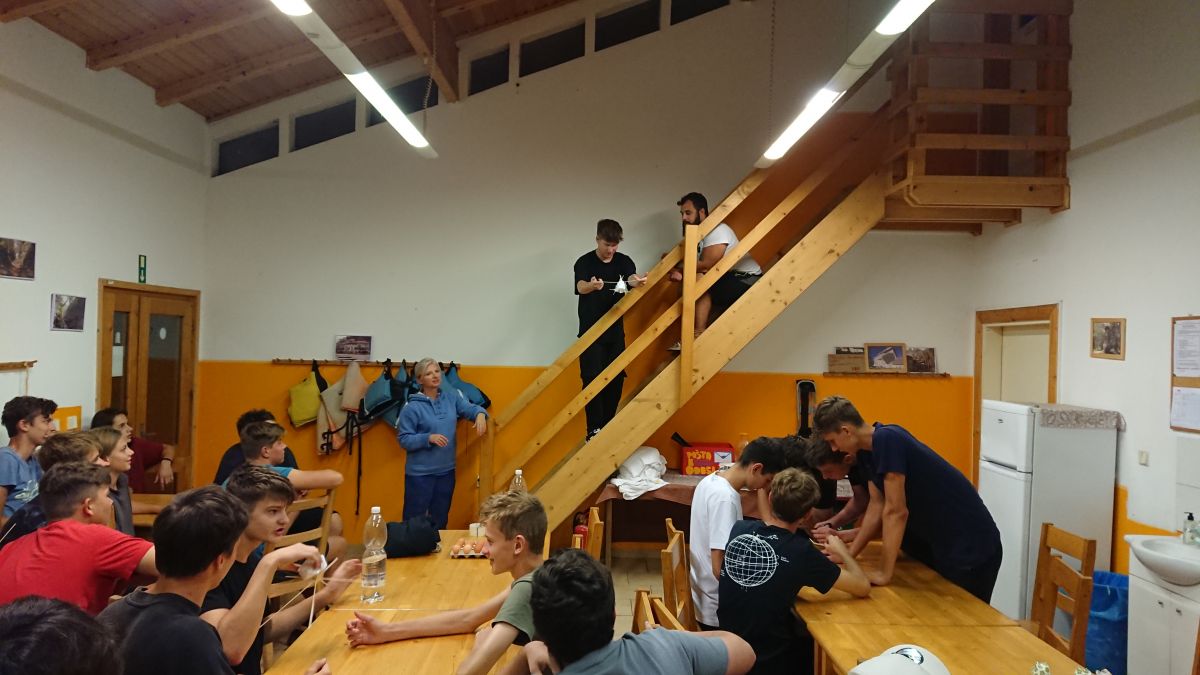 V úterý po snídani přišla hlavní zátěžová zkouška. U snídaně jsme nafasovali balíčky s občerstvením a pak už nás čekala zhruba 15 km dlouhá pěší túra do Mšena. Vedoucím smečky se stal kolega Tomáš Louthan. Nejprve jsme si to namířili k Harasovu, dále po červené k občerstvení U Grobiána, kde jsme si zahráli kvízovou hru „Co je pumpopáček?“, a odtud „myší dírou“ nad Mšeno. I tento náročný terén všichni statečně zvládli, a tak si ve zmrzlinovém ráji mohli dopřát zaslouženou odměnu. Všech šestašedesát se nás nakonec nasoukalo do jednoho vagónu motoráčku, kterým jsme se svezli zpět do Lhotky. Po večeři následovaly týmové pohádkové „aktivity“ a pak se každá třída pustila do vymýšlení svého třídního loga. Posledním bodem úterního programu bylo vymyslet a zkonstruovat ve skupinách „airback“ pro vejce, které následně padalo z výšky 2 metrů. O kreativní nápady nebyla nouze a všichni se navíc dobře bavili.