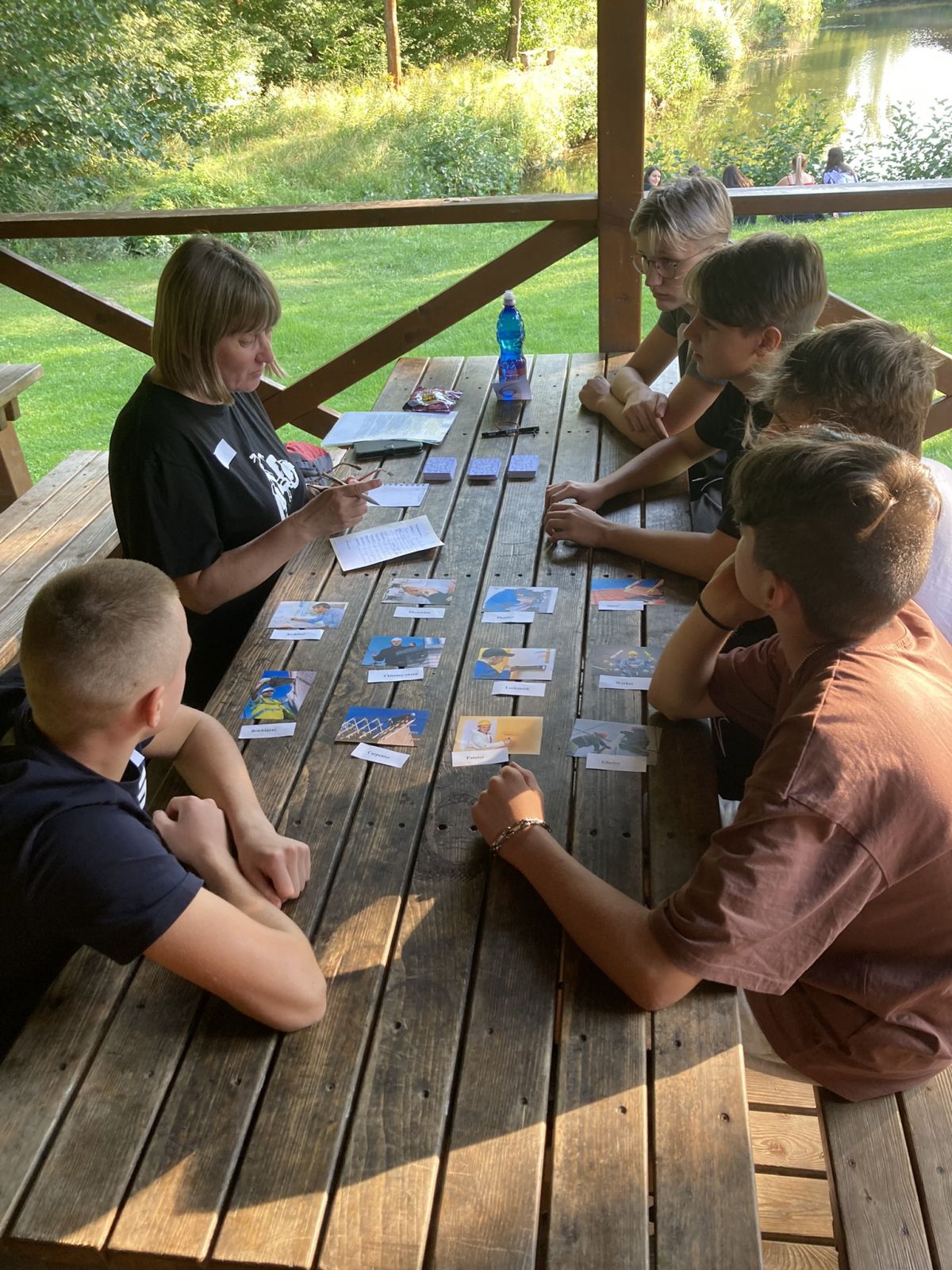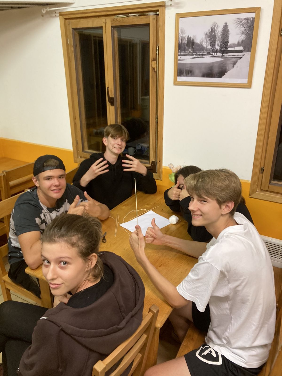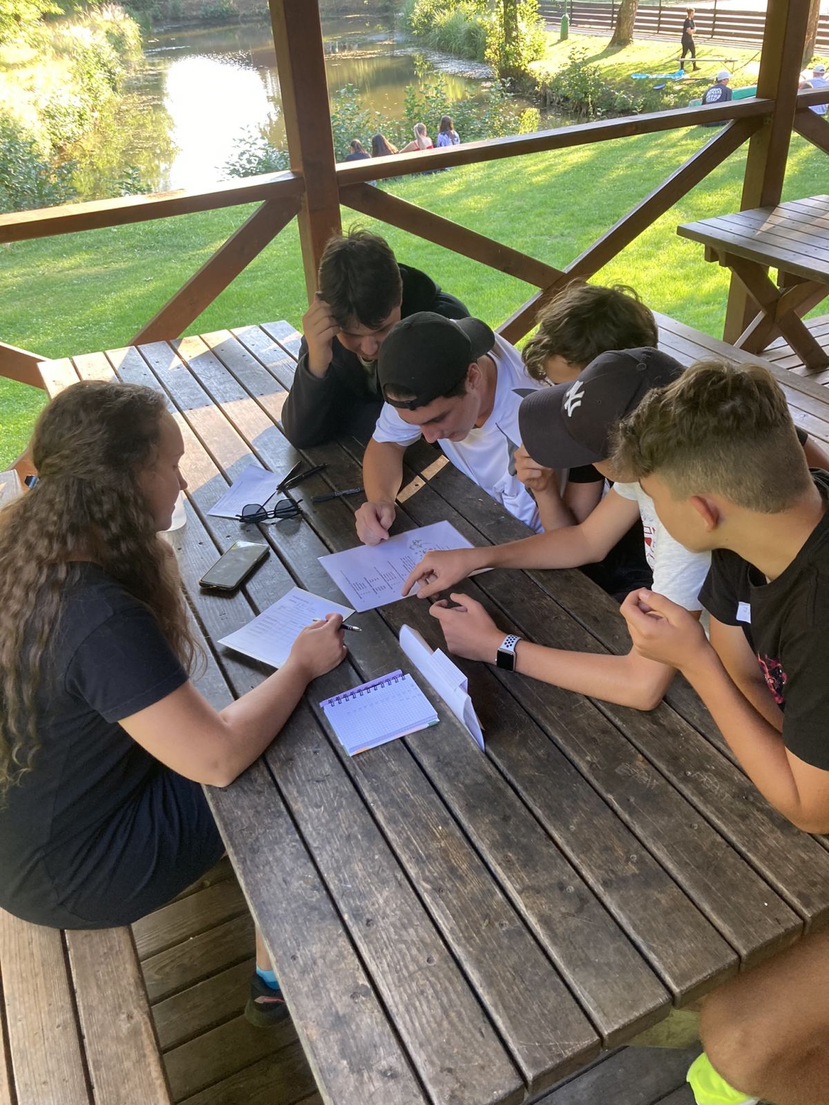 V úterý po snídani přišla hlavní zátěžová zkouška. U snídaně jsme nafasovali balíčky s občerstvením a pak už nás čekala zhruba 15 km dlouhá pěší túra do Mšena. Vedoucím smečky se stal kolega Tomáš Louthan. Nejprve jsme si to namířili k Harasovu, dále po červené k občerstvení U Grobiána, kde jsme si zahráli kvízovou hru „Co je pumpopáček?“, a odtud „myší dírou“ nad Mšeno. I tento náročný terén všichni statečně zvládli, a tak si ve zmrzlinovém ráji mohli dopřát zaslouženou odměnu. Všech šestašedesát se nás nakonec nasoukalo do jednoho vagónu motoráčku, kterým jsme se svezli zpět do Lhotky. Po večeři následovaly týmové pohádkové „aktivity“ a pak se každá třída pustila do vymýšlení svého třídního loga. Posledním bodem úterního programu bylo vymyslet a zkonstruovat ve skupinách „airback“ pro vejce, které následně padalo z výšky 2 metrů. O kreativní nápady nebyla nouze a všichni se navíc dobře bavili.