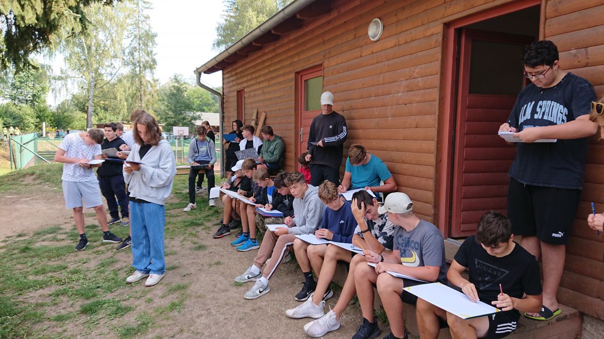 Na středeční dopoledne byli žáci odsouzeni k práci rukama. Instruktáž a odborné vedení zajistila Lucie Marečková, a tak mohly vzniknout krásné kresby táborových chatek.
