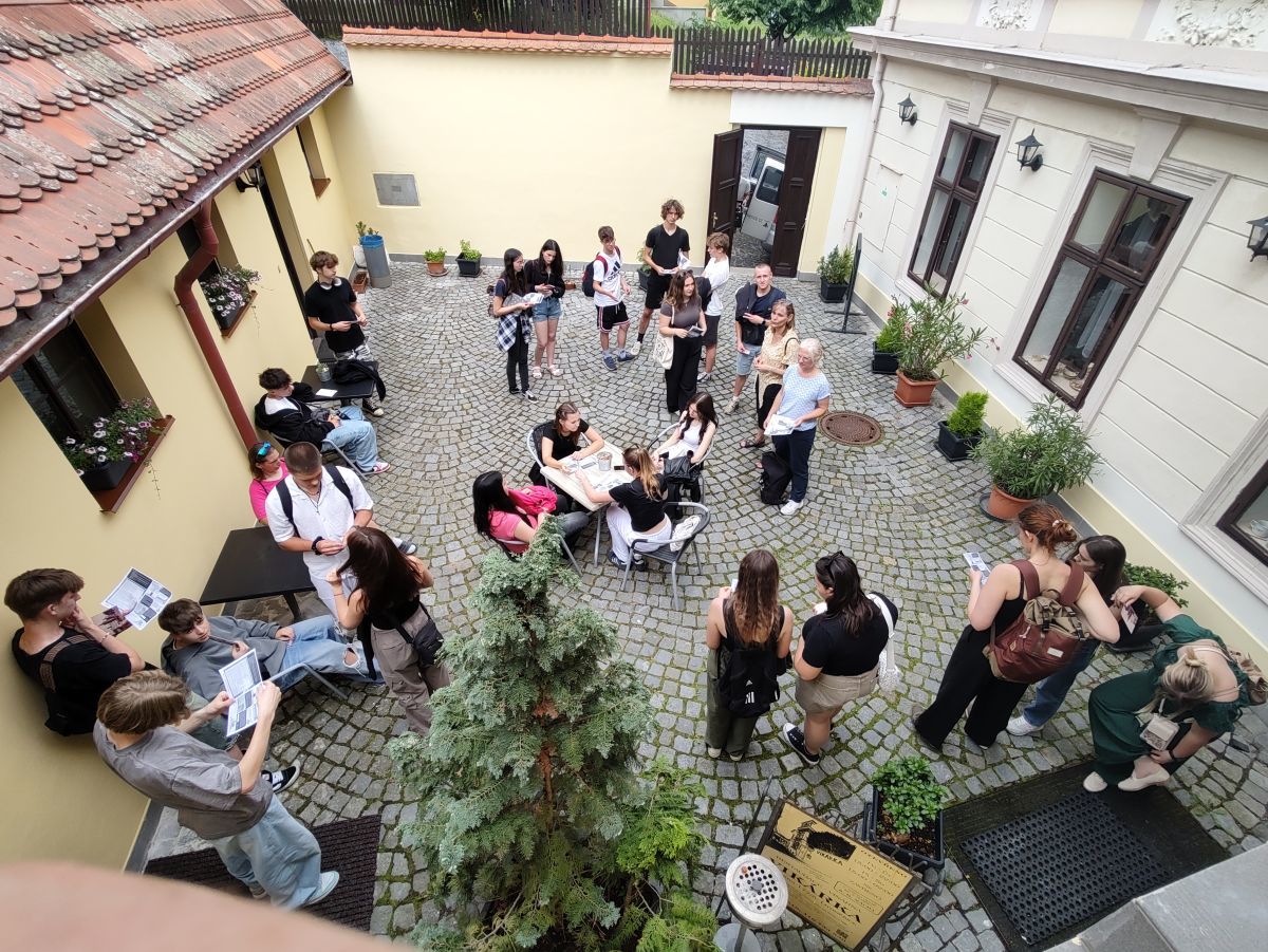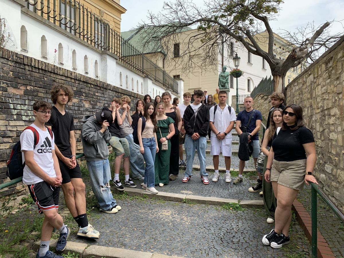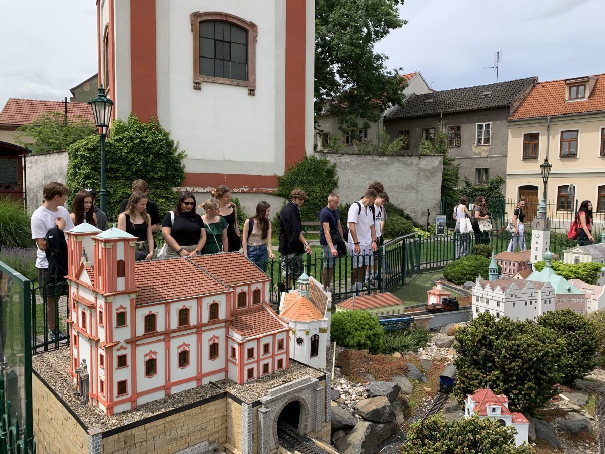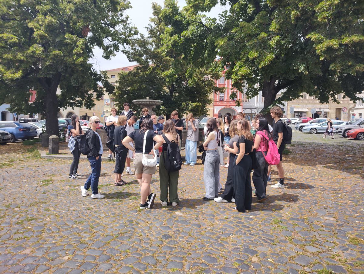 Následně jsme se vydali pěšky do Litoměřic, na dohled jsme měli nejen věže katedrály sv. Štěpána, ale i panorama Českého středohoří a oblíbená místa Karla Hynka Máchy – Hazmburk, Košťálov, či Radobýl. Za dvacet minut jsme byli až v centru města, kde jsme si nejprve udělali občerstvovací pauzu a pak už nás provázel slavný romantik, který tu sice bydlel jen několik týdnů (připravoval byt pro svou rodinu), ale celých 102 let ležel na místním hřbitově, než byl v roce 1938 po mnichovském diktátu převezen do Prahy a pohřben na Vyšehradě. Město je na tohoto básníka náležitě hrdé, a tak jsme prošli kolem Máchova divadla, Máchovy busty, po Máchových schodech do Máchovy ulice až do Máchovy světničky – zdrobnělina není tak úplně eufemismus, spíše vystihuje obytnou plochu dostačující možná pro dva dospělé, nikoli pro skupinu pětadvaceti osob …