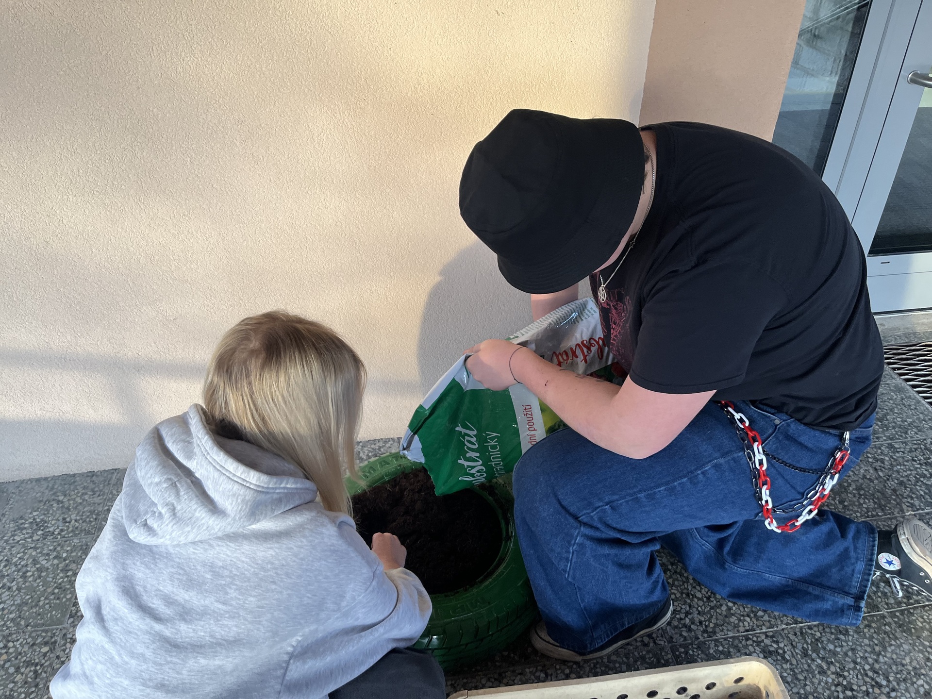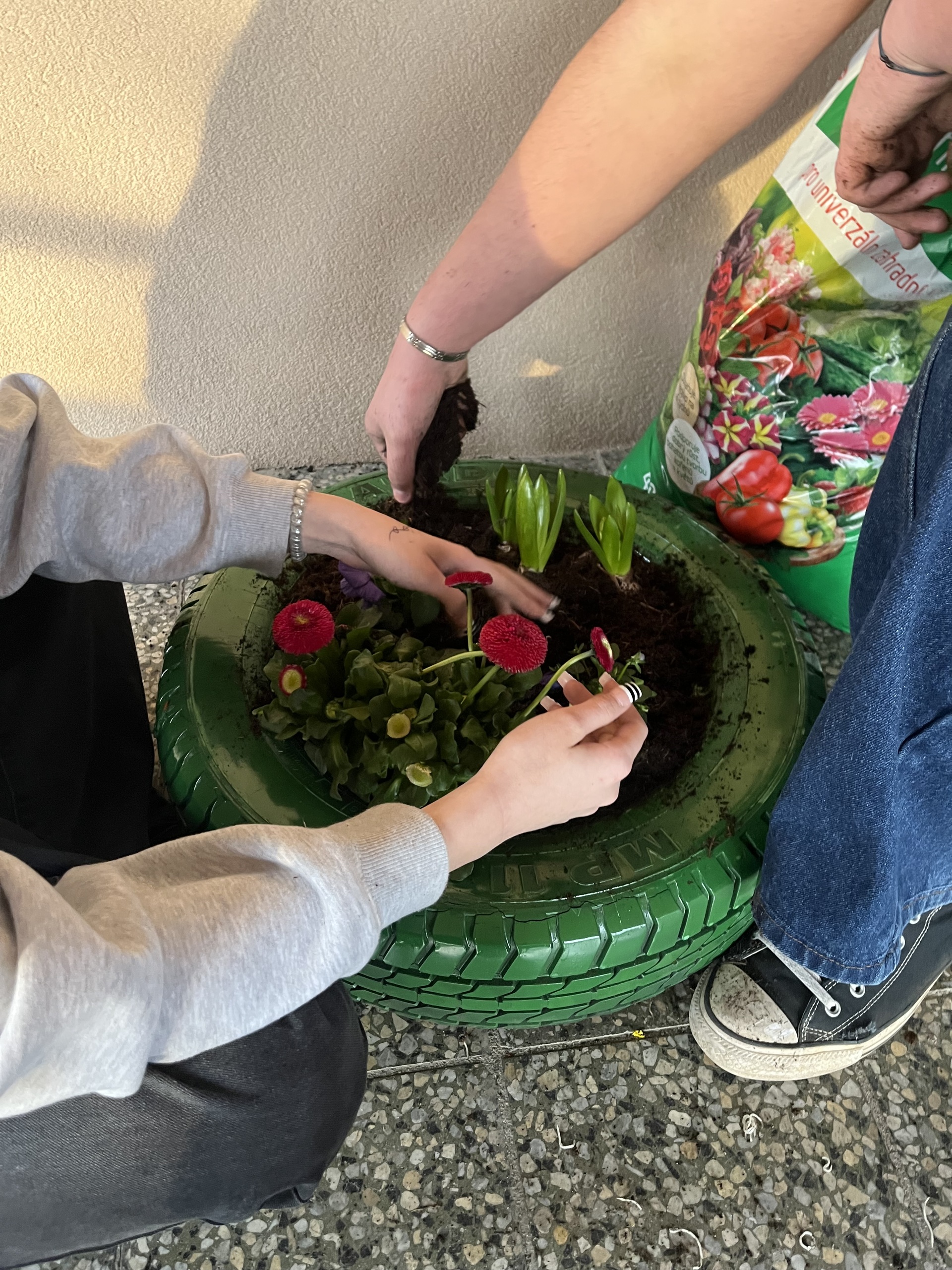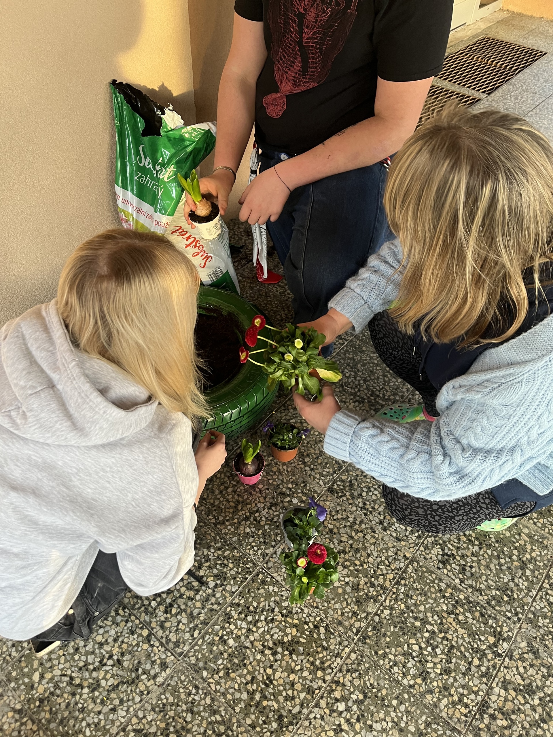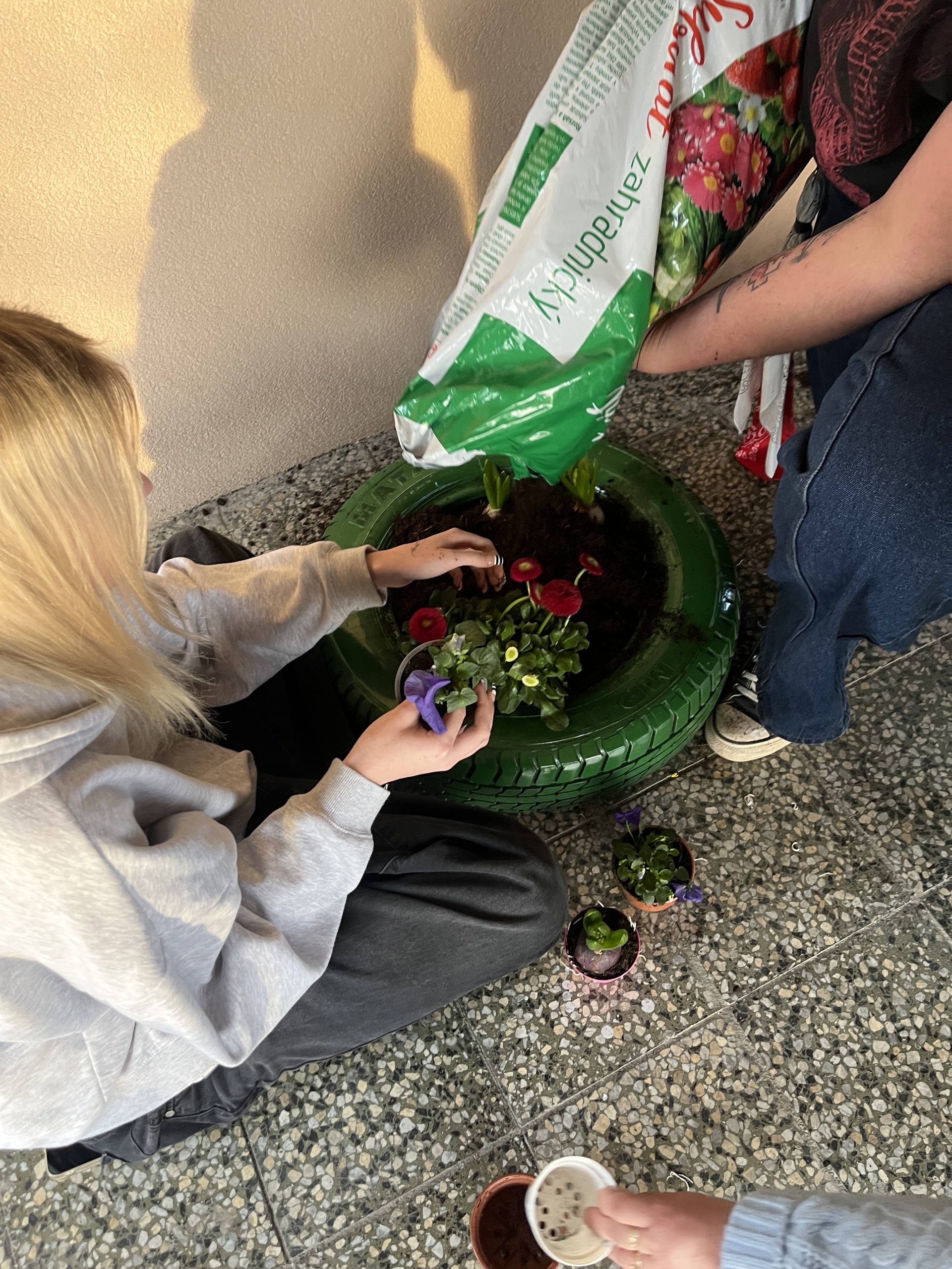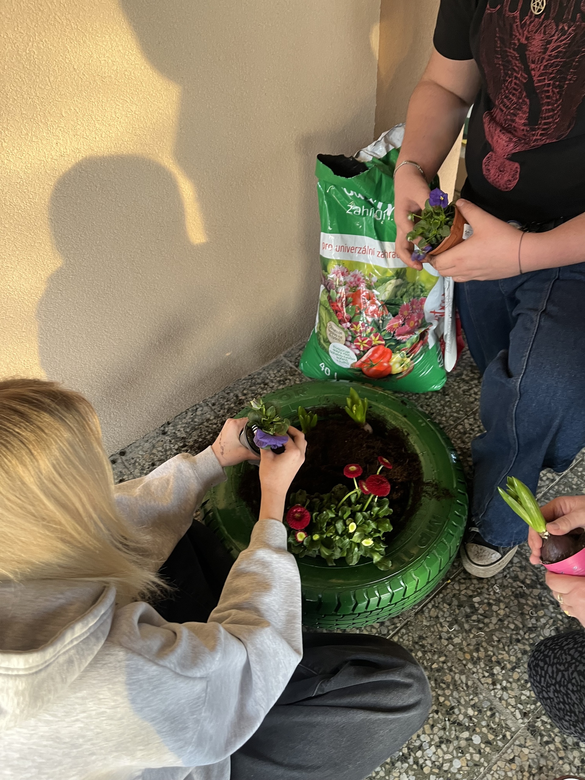 S přicházejícím jarem jsme i my zatoužili po jarních kytičkách a kvetoucím záhoně. A tak jsme si místo záhonu nastříkali pneumatiku, do ní jsme vložili drevěné destičky, na ně dali igelit, do kterého jsme udělali několik otvorů, aby měla kudy vytékat voda. Nasypali jsme zeminu a nakonec osázeli kytičkami. A teď už se můžeme jen radovat z krásně ozdobeného vchodu do domova mládeže.