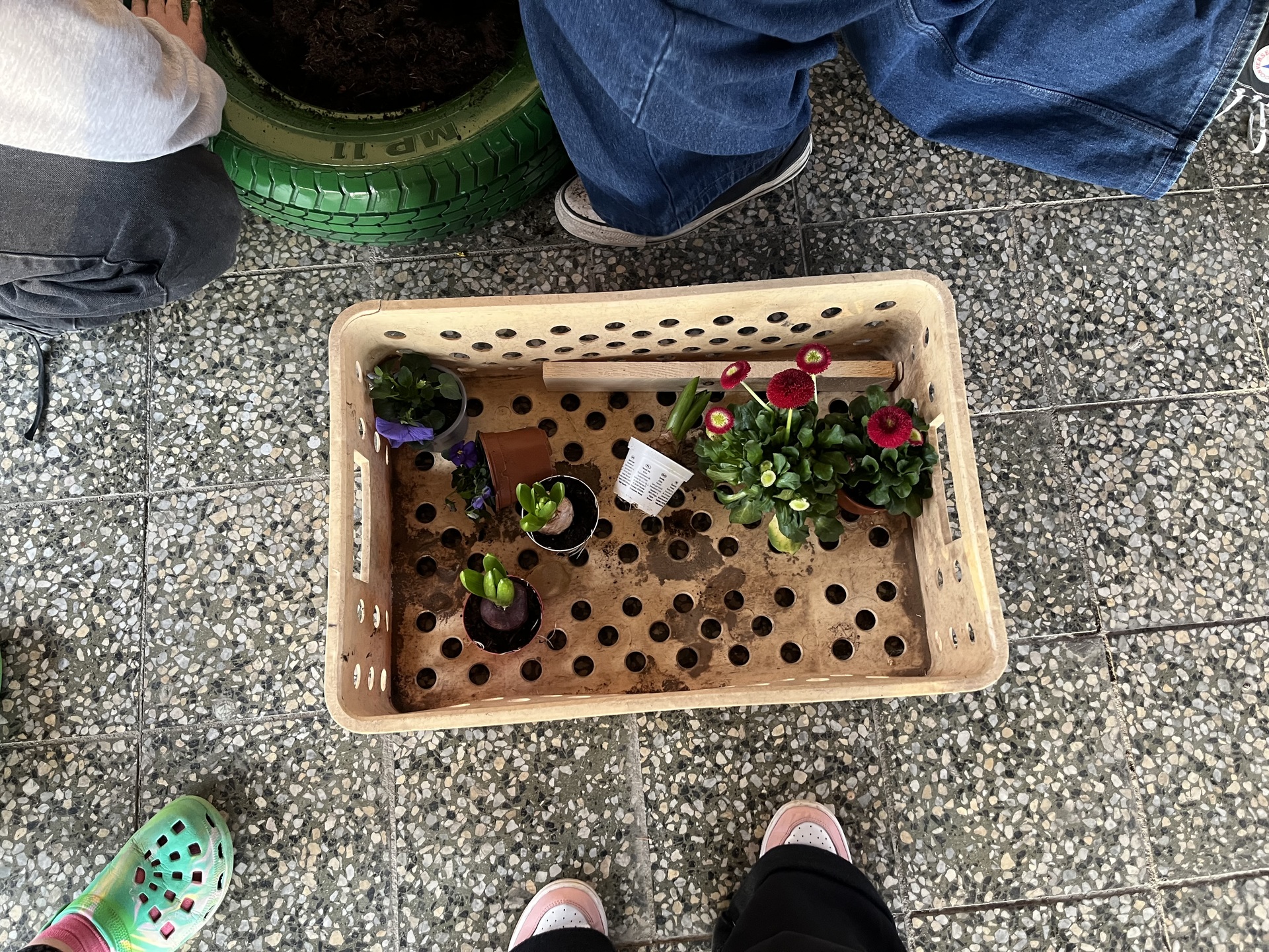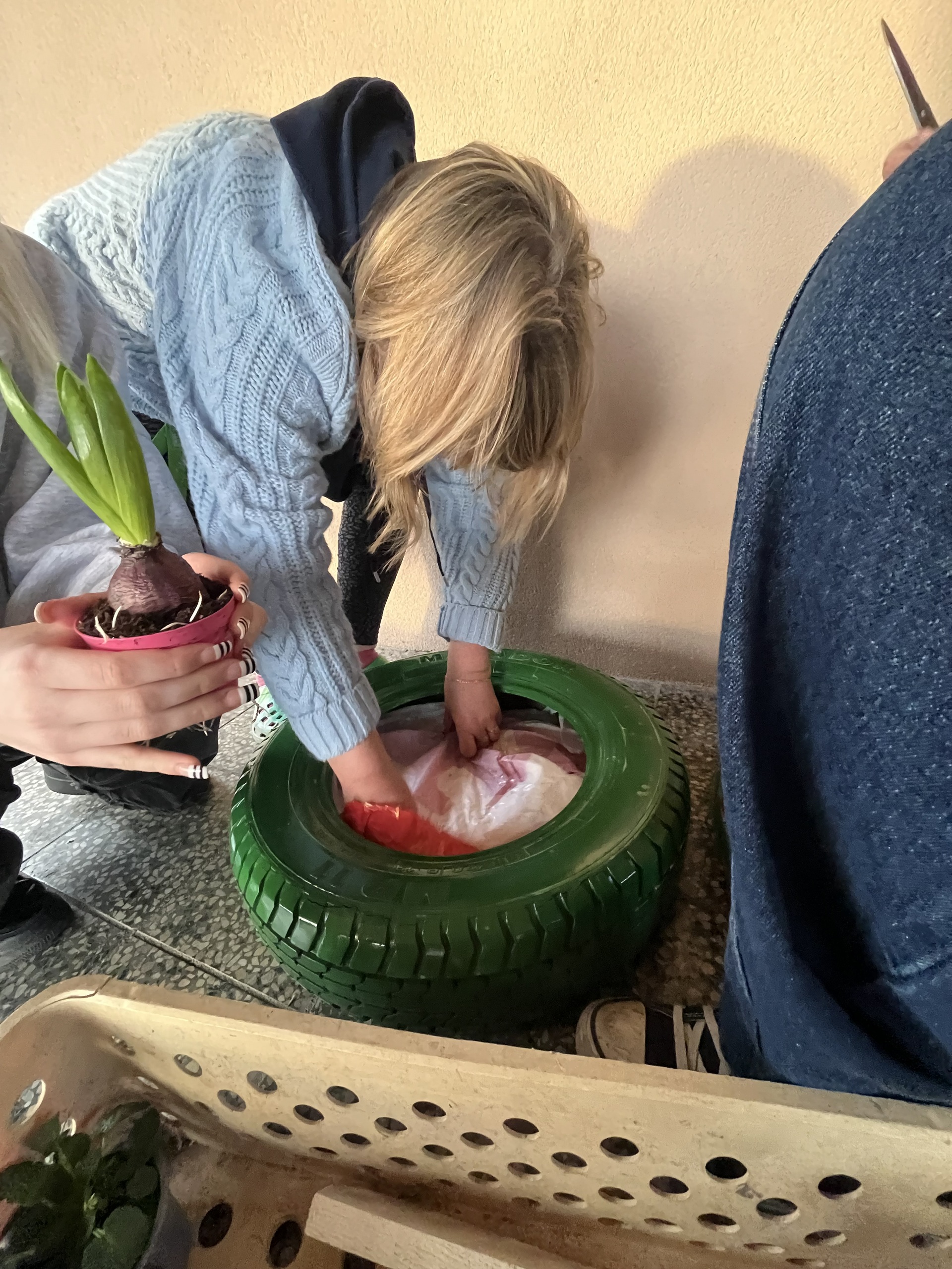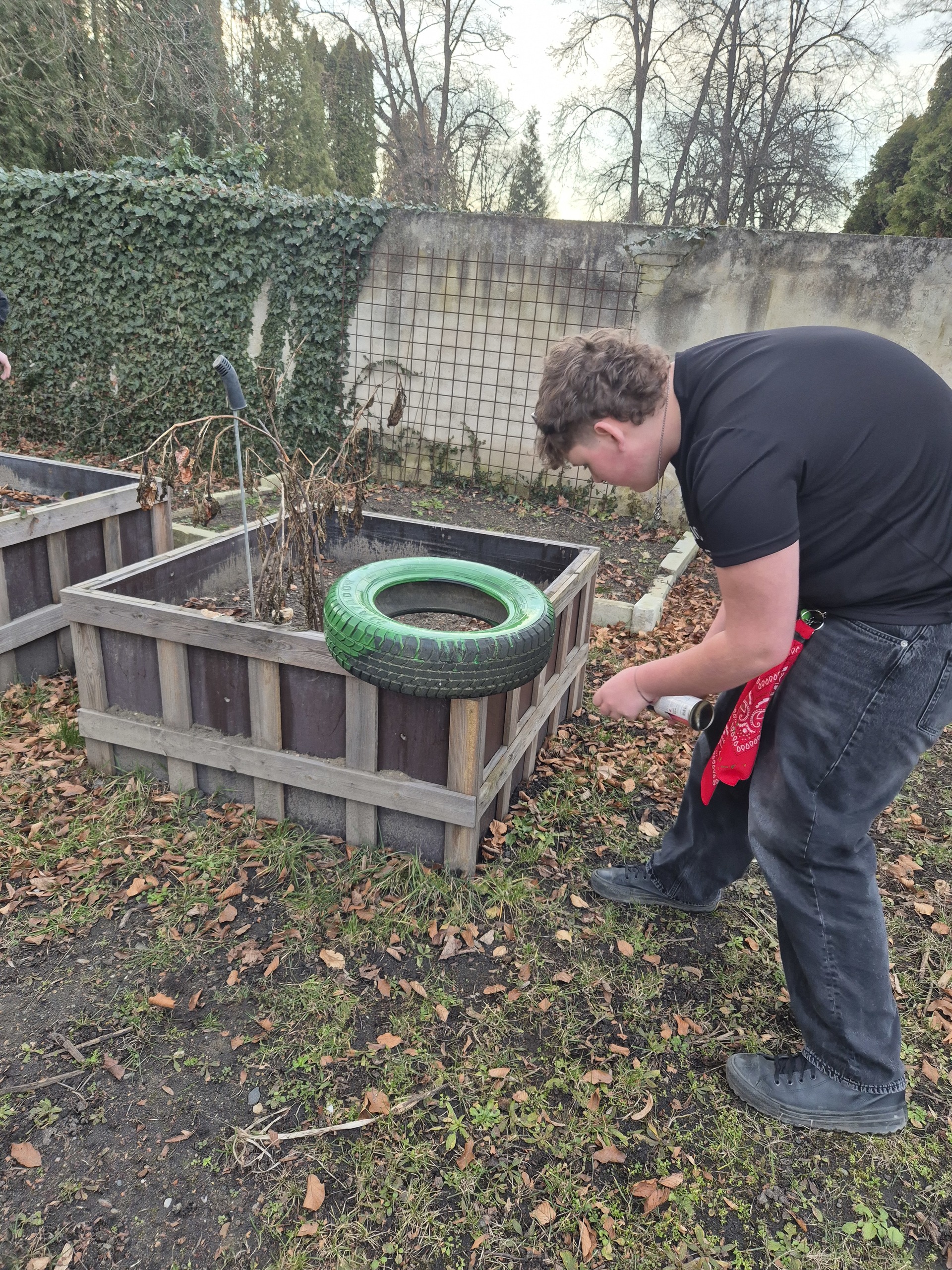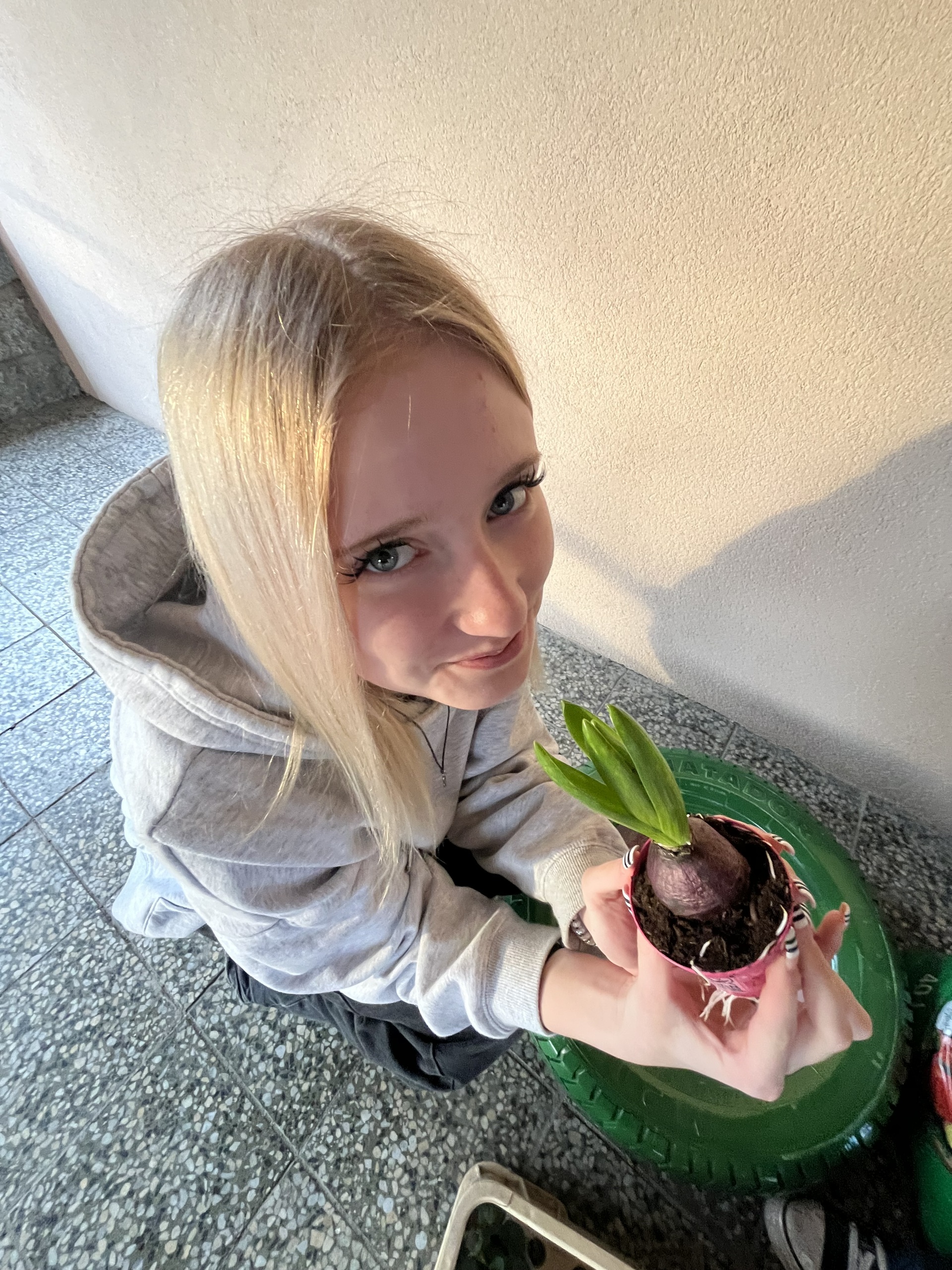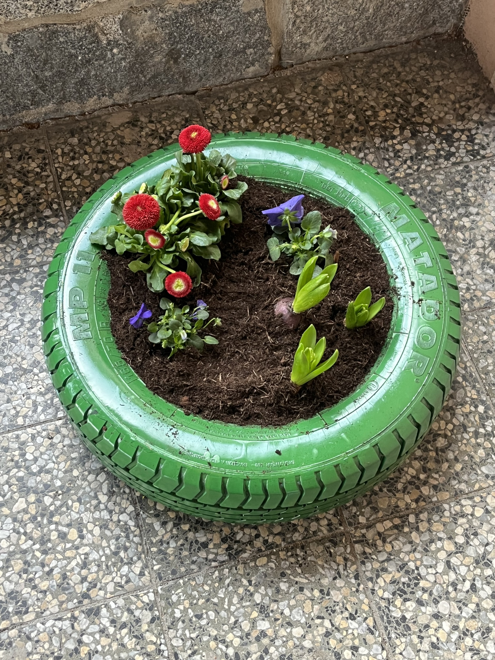 S přicházejícím jarem jsme i my zatoužili po jarních kytičkách a kvetoucím záhoně. A tak jsme si místo záhonu nastříkali pneumatiku, do ní jsme vložili drevěné destičky, na ně dali igelit, do kterého jsme udělali několik otvorů, aby měla kudy vytékat voda. Nasypali jsme zeminu a nakonec osázeli kytičkami. A teď už se můžeme jen radovat z krásně ozdobeného vchodu do domova mládeže.