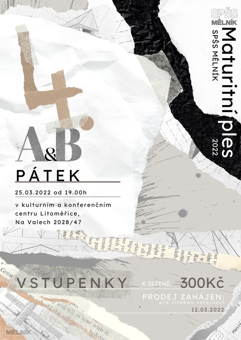 Maturanti ze třídy 4.A a 4.B zvou příznivce SPŠS Mělník na maturitní ples. Koná se 25.3.2022 od 19 hodin v MKZ v Litoměřicích. Vstupenky k prodeji na e-mailu: louthan.t@spss-mel.cz, tel: 728 744 734.