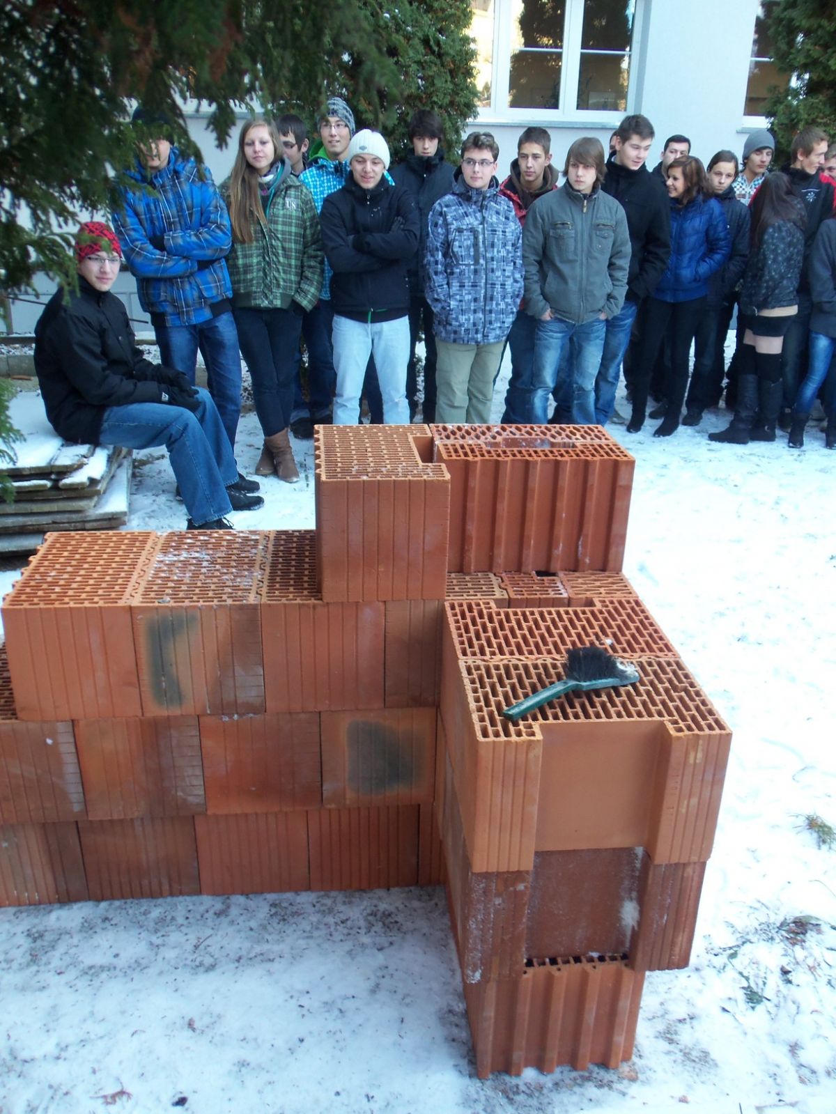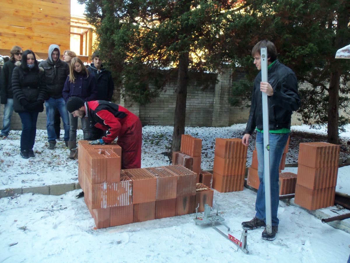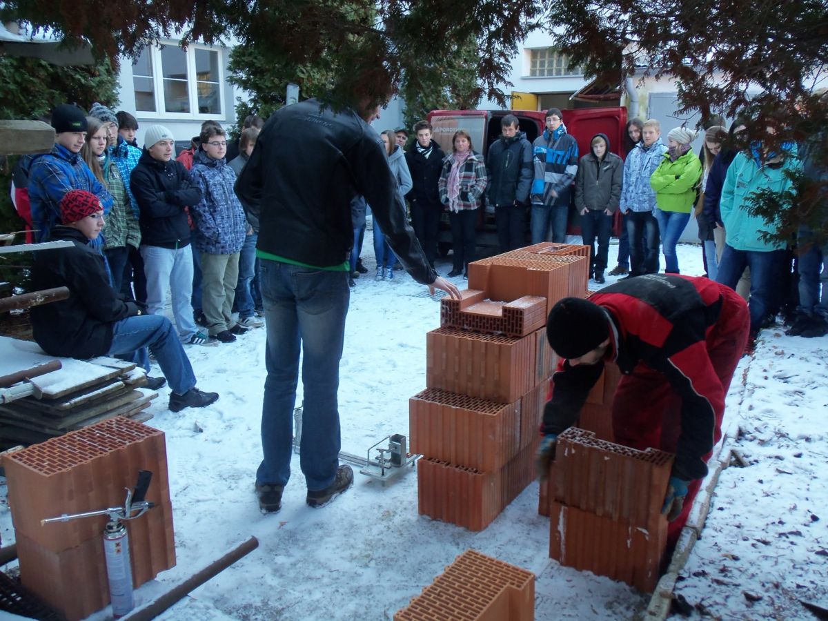 Aby žáci získali ještě podrobnější znalosti a přehled o výrobcích cihelných, oslovili jsme stavební firmu Wienerberger. Přednáška na téma zdící materiály byla obohacena o informace o požadavcích na moderní zdivo a dodržování tepelně-technických norem. Přesto, že venku mrzlo, vzniklo na školním dvoře provizorní staveniště, kde žákům prvního a druhých ročníků zástupce firmy ukázal, jak se z moderních tvárnic zdí. Ukázka se týkala vyzdívání ostění a parapetu.