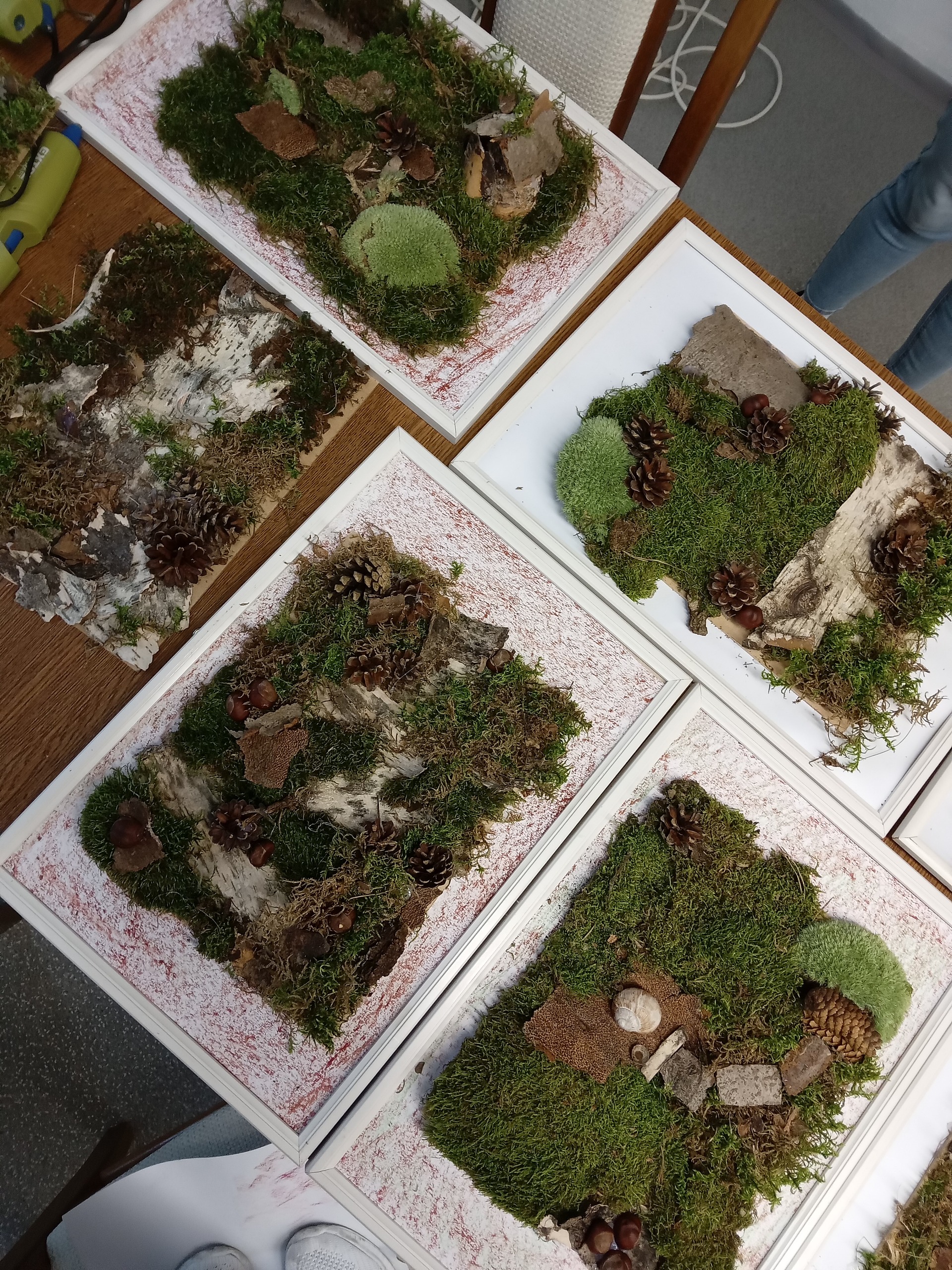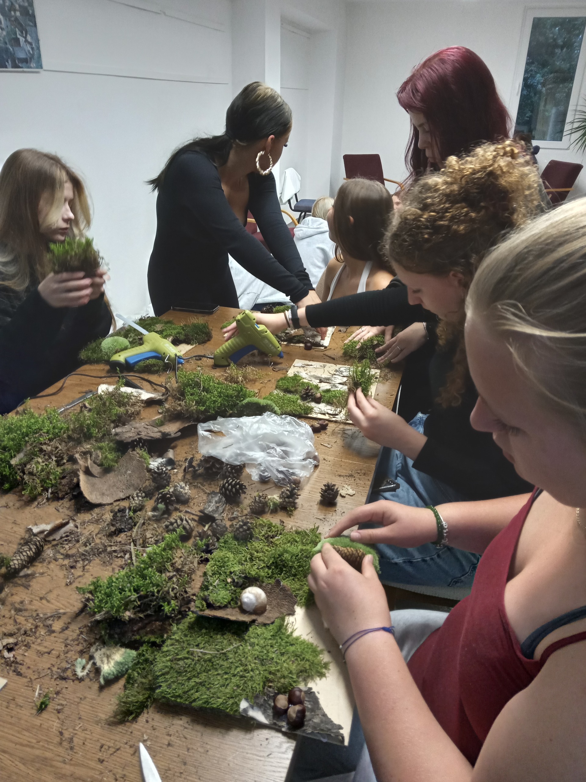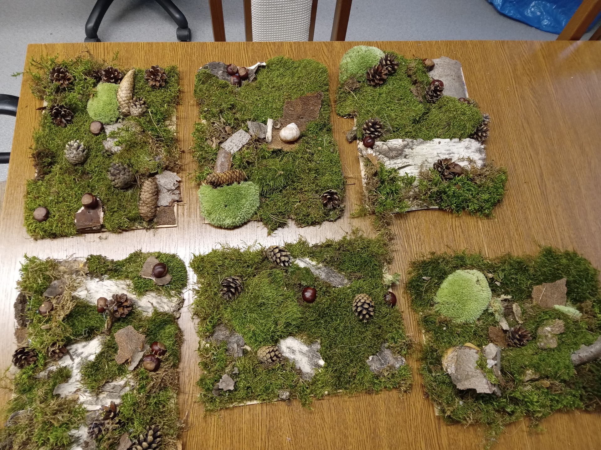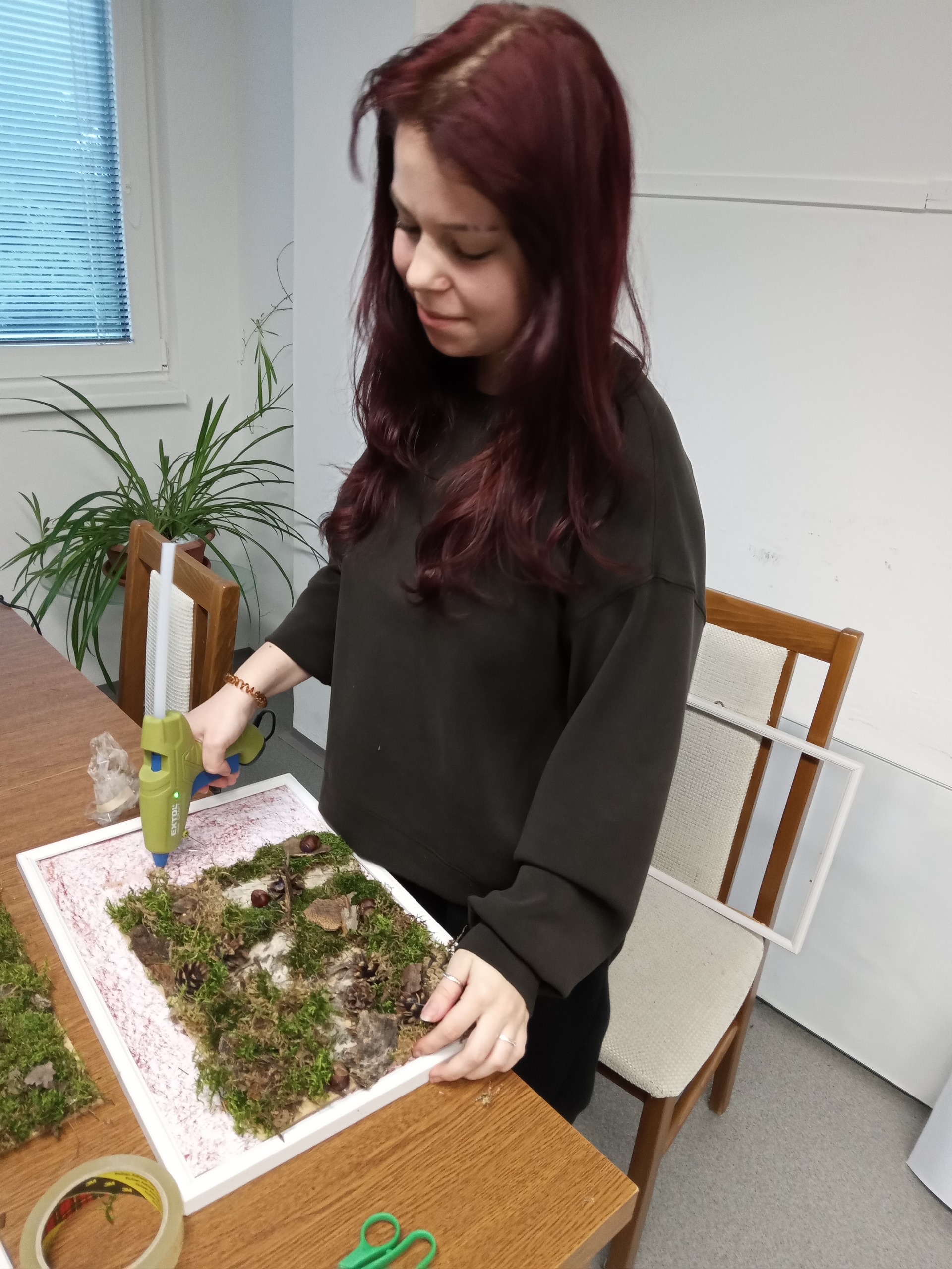 Čas strávený na vycházkách jsme využili ke sběru přírodních materiálů, z kterých jsme vyrobili obrázky k podzimní výzdobě domova mládeže.