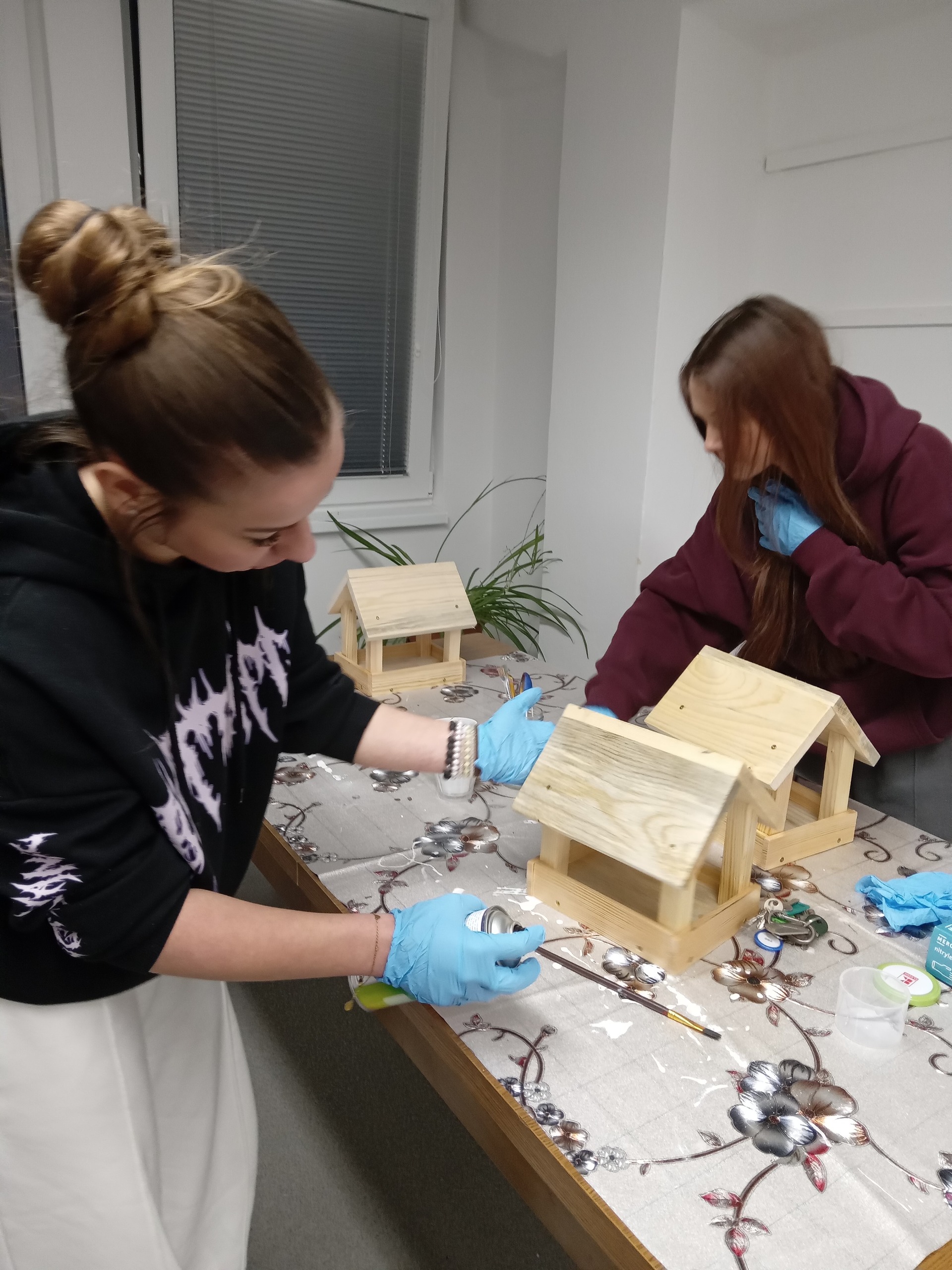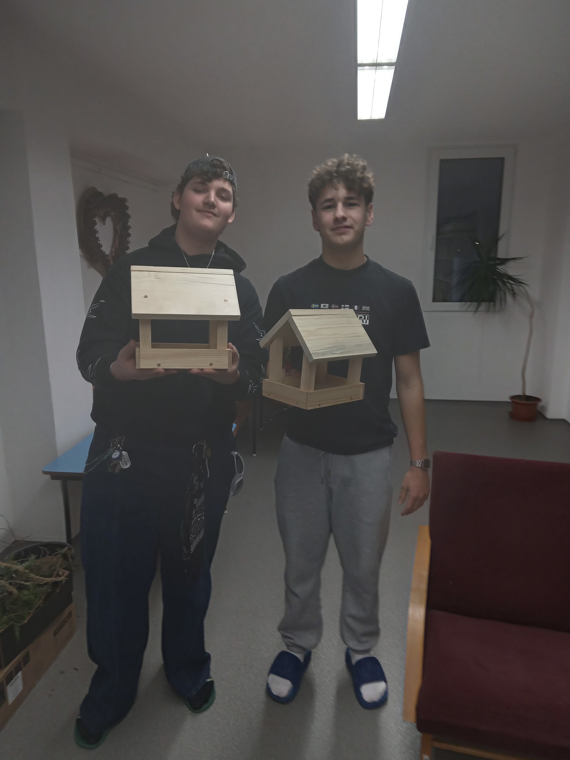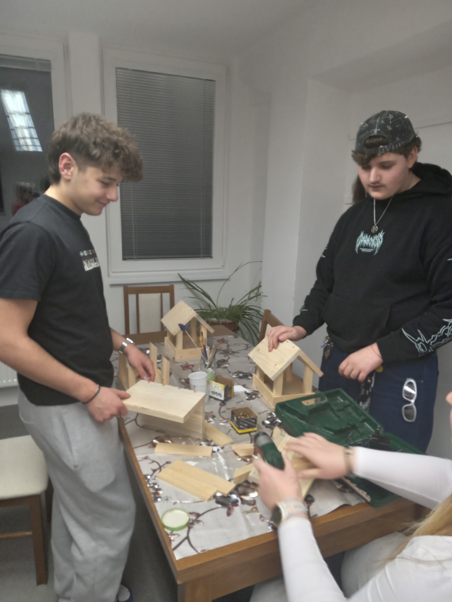 Povídání o zimním počasí nás přimělo k zamyšlení, čím se asi živí zvířata a ptáci v zimě. Rozhodli jsme se ptáčkům pomoci a vyrobili jsme krmítka, která pověsíme v parku a okolo domova mládeže. Sehnali jsme si vhodné dřevěné díly a v klubovně jsme je sešroubovali a nastříkali lakem. Budeme ptáčkům sypat slunečnicová semínka, lojové kuličky se semínky apod.