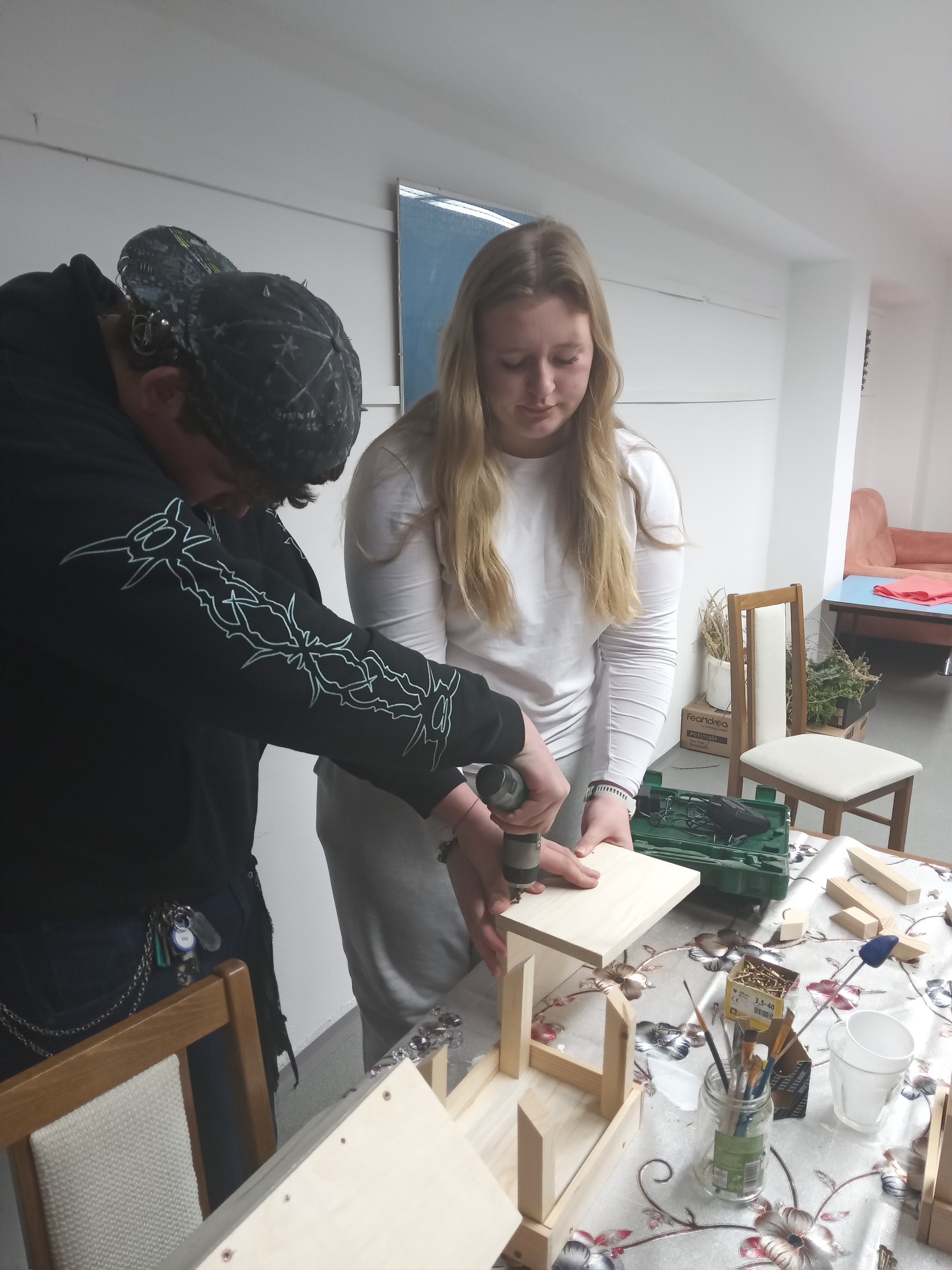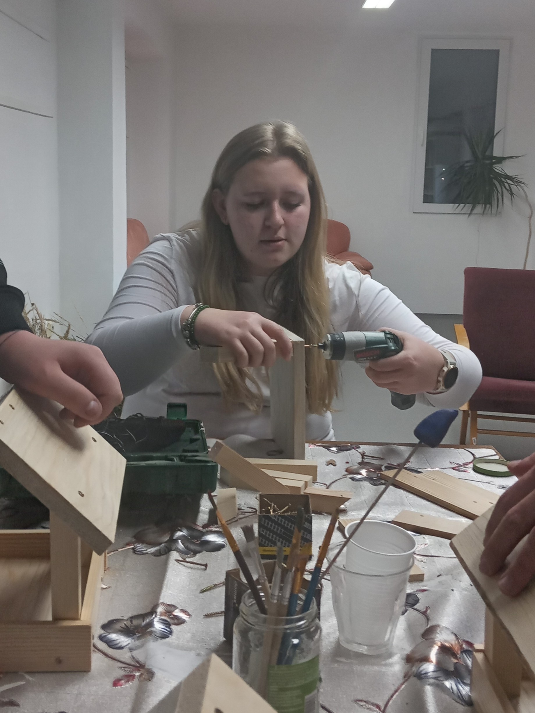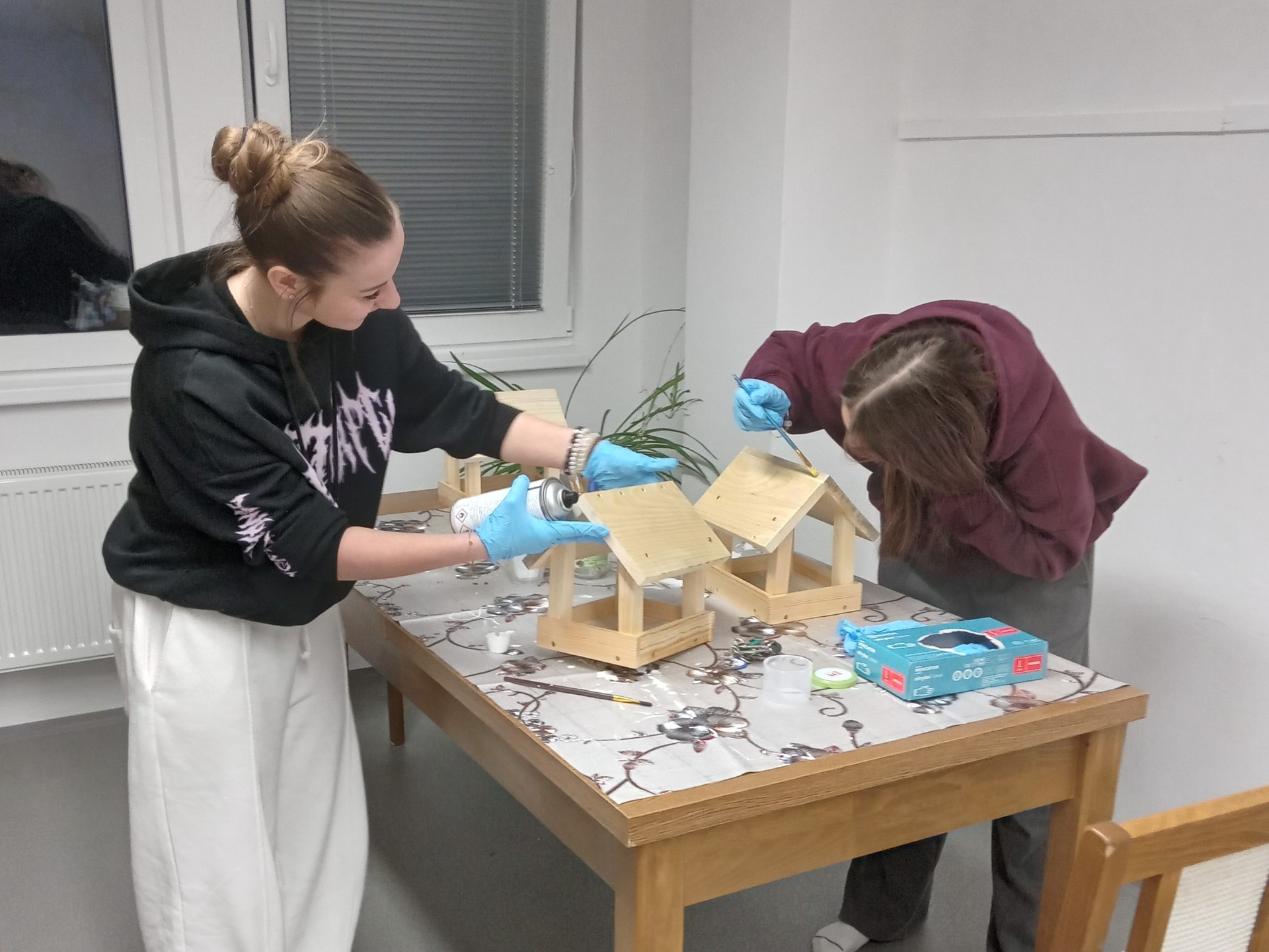 Povídání o zimním počasí nás přimělo k zamyšlení, čím se asi živí zvířata a ptáci v zimě. Rozhodli jsme se ptáčkům pomoci a vyrobili jsme krmítka, která pověsíme v parku a okolo domova mládeže. Sehnali jsme si vhodné dřevěné díly a v klubovně jsme je sešroubovali a nastříkali lakem. Budeme ptáčkům sypat slunečnicová semínka, lojové kuličky se semínky apod.